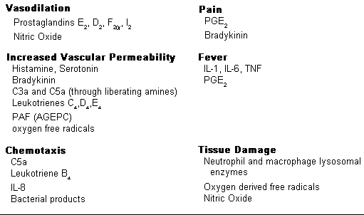 The important substances mediating the processes of acute inflammation are displayed to the right: