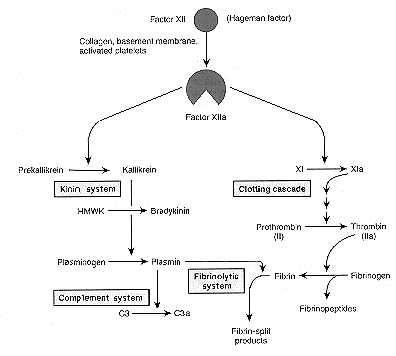 Clotting does not occur until later in the acute inflammatory response unless injury is severe or vasculature is damaged. Early clotting is apparently inhibited by heparin released from mast cells and much fibrinogen (MW = 340,000) probably does not enter the exudate unless vascular permeability is greatly increased from more severe injury. Mediators of the clotting/fibrinolysis system include: