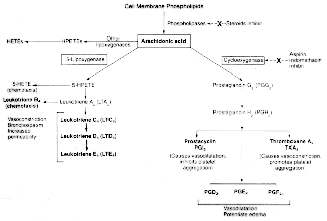 Aspirin and other NSAIDs inhibit cyclooxygenase but not lipoxygenase. Anti-inflammatory steroids stabilize membranes and prevent phospholipid hydrolysis thereby inhibiting both pathways.