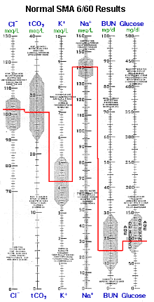Metabolic acid/base disturbances are almost always associated with disturbances in fluid and electrolyte balance. Tests in the panel to the right are used to assess metabolic acid/base disturbances and associated disturbances in fluid and electrolyte balance. Normal ranges are shown by the gray areas for each test. The position of the horizontal red line represents a test result. Total CO2 represents bicarbonate concentration and reflects acid/base status; urea (BUN)and the urea/creatinine ratio reflect fluid balance status; electrolyte concentrations are altered characteristically in specific disturbances.